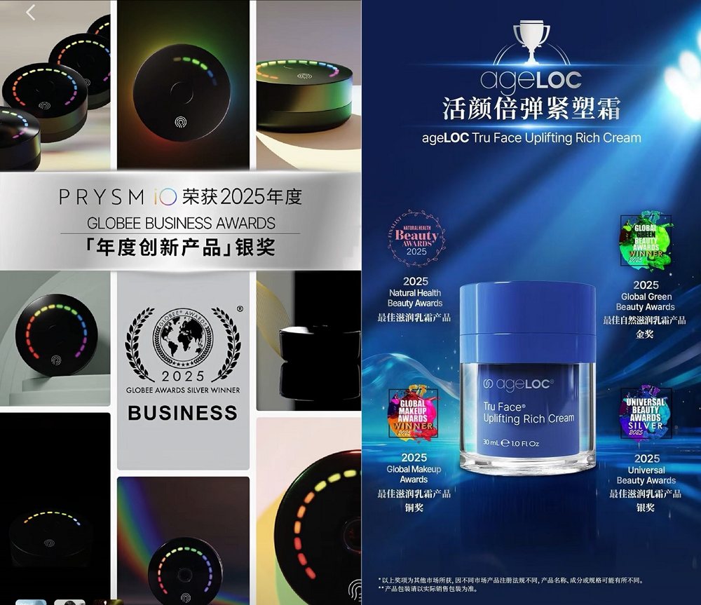 欧睿国际最新调研数据显示,如新是 2023 和 2024 连续两年全球零售额第一的美容与健康仪器系列公司(数据源自 Euromonitor International Limited;按 2023 和 2024 全球各公司居家美容与健康仪器系列整体零售渠道零售额,不包含美容院线服务,于 2025 年 7 月完成调研),彰显了其在仪器护肤领域的全球领先地位。在 2025 Global Makeup Awards(2025年度全球化妆大奖*)评选中,如新产品凭借出众的产品力在近十个品类中脱颖而出,收获多项重磅奖项:ageLOC Tru Face Refining Toner(活颜精萃水)荣获最佳护肤产品银奖*;ageLOC Tru Face Uplifting Rich Cream(活颜倍弹紧塑霜)与ageLOC Tru Face Essence Ultra(活颜倍弹源液)分别斩获最佳滋润乳霜产品铜奖及最佳精华产品银奖*。近期推出的超光谱智能扫描仪 Prysm iO 荣获 2025 年度 Blobee Business Awards 年度创新产品银奖*。