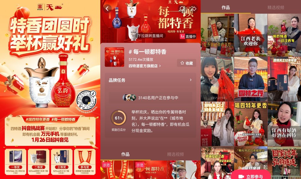 年味渐浓,酒香愈醇。随着春节的临近,“举杯四特酒,幸福中国年-喝四特年更香”四特酒春节系列活动也持续升温。其中,线上抖音挑战赛自1月26日启动以来,#每一顿都特香#四特酒 话题迅速引爆春节社交平台,截止目前,累计播放量已达5400W+,参与人数超7200人,数据仍在不断刷新。多圈层达人携手普通创作者共同发力,呈现海量优质内容,让“喝四特,年更香”的元素融入万千欢聚场景,掀起一股全民线上分享年味的热潮。