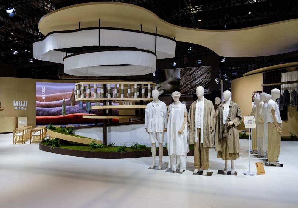 MUJI展馆位置位于6.2馆(消费品馆), 展馆的设计灵感源于大地层叠肌理与时光沉淀。展馆整体空间建造为起伏流动的造型,如同土地般自然生长,依势延展出服装、家居、食品、护肤及绿色可持续等多元展示区域,诠释从土地到生活的延续与共生。