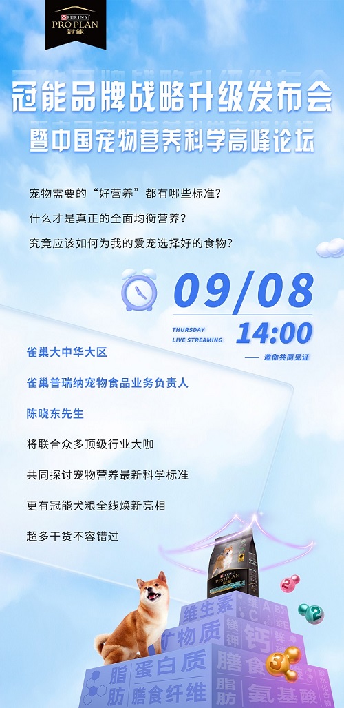 9月8日,雀巢普瑞纳将以线上云发布的形式举行冠能品牌战略升级发布会暨中国宠物营养科学高峰论坛,展示其作为全球宠物食品行业开创者在新趋势下的新思考。