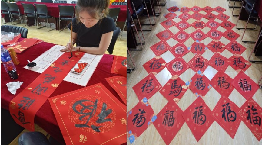 活动现场,红彤彤的福字底纸整齐排列,笔墨砚台依次摆放,浓厚的新春气息扑面而来。张琪悦端坐案前,凝神聚力,蘸取浓墨后挥毫疾书。楷书的端庄规整、行书的流畅洒脱在她笔下尽显汉字之美,一笔一划间饱含着对家乡的深情、对新年的期许。“福”字承载着中国人最朴素的美好愿望,她以书法形式为乡亲们送上祝福,践行了“返家乡”社会实践的服务宗旨,额间沁出的细汗丝毫未影响她的专注,每一幅作品都凝聚着真诚与匠心。