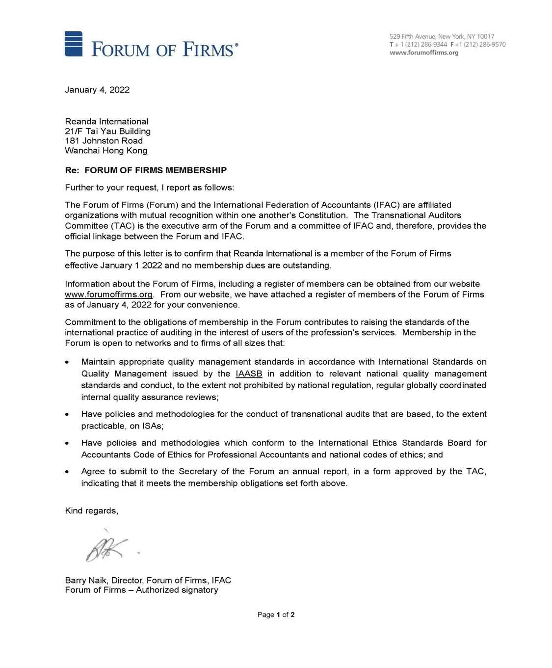 图为自2022年1月1日起,利安达国际被批准成为FoF的正式会员