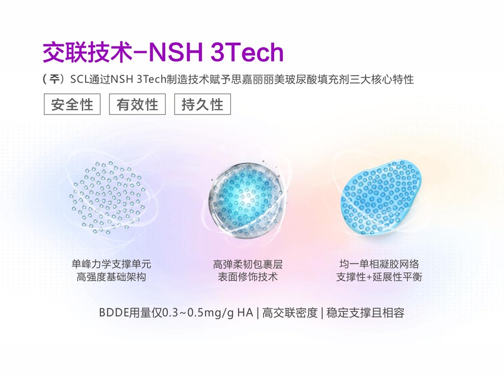 依托SCL集团14年的产品研发积淀,思嘉丽丽美玻尿酸历经多轮精心研发与严格测试,最终凭借创新的NSH 3Tech交联制造技术,在提升材料支撑力的同时,实现了“更安全、更自然”的塑美效果,形成“强支撑、易推注、超纯净”三大核心技术优势,真正将前沿科研技术与舒适塑美体验深度融合。