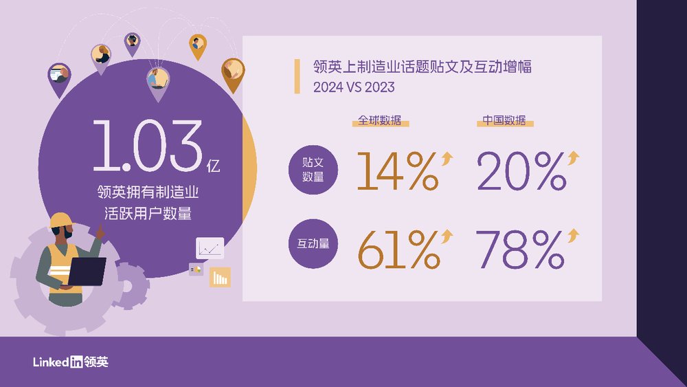 ●价值一:全漏斗受众触达。领英报告显示,制造业决策链日益复杂,企业需提升识别与触达全漏斗受众的能力,包括目标客户、关键决策者、KOL、潜在人才,以及有影响力的行业伙伴。而领英拥有1.03亿制造业用户,490万制造业企业,2024年领英上制造业话题贴文的数量较2023年增加14%,互动量增长61%;而中国制造业企业在领英上发布的贴文数量较2023年同比增长了20%,互动量增长更是高达78%。这表明制造业企业正日益依赖领英这样的全球化平台获取行业洞察与商业人脉,其中欧洲制造业企业决策者更是将领英视为获取市场研究信息的首选平台,比第二名的社交平台使用率高出104%。