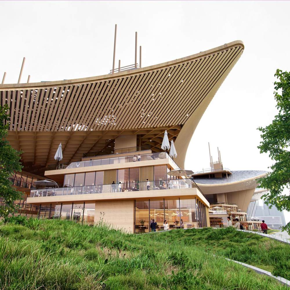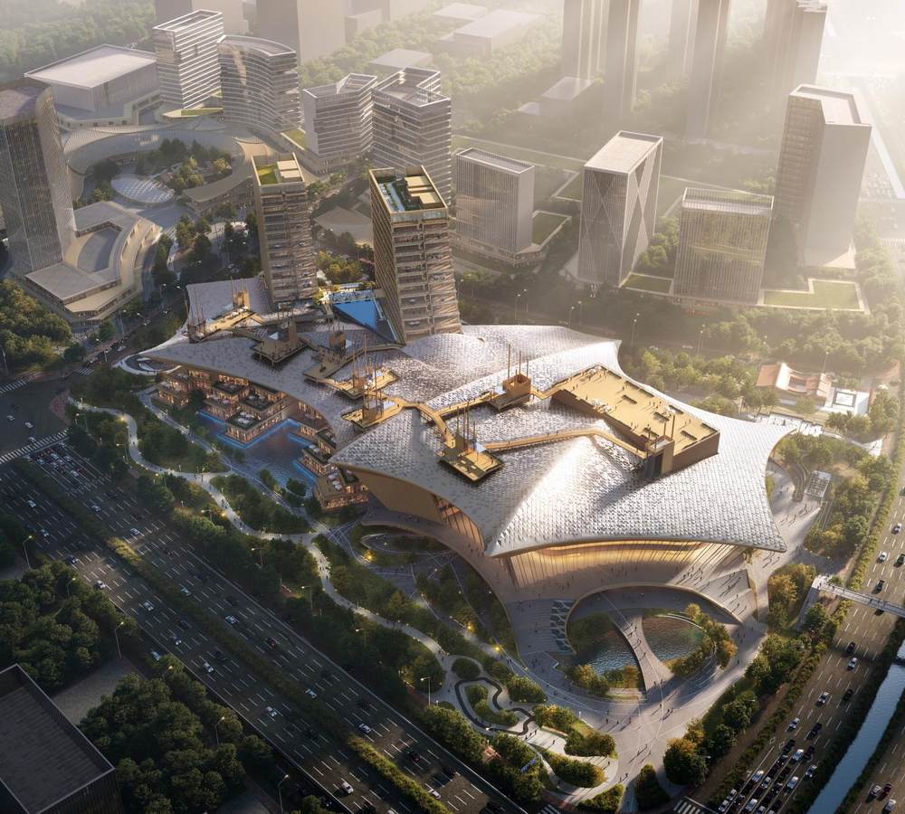 建筑设计以“扬帆起航”为意象:临街的剧场如挺立船首,两侧酒店双塔似扬起的巨帆;屋顶曲线取自闽南传统“燕尾脊”,整体轮廓模拟海浪起伏;十二个高低错落的平台,象征宋元时期泉州港的十二个繁荣码头;外立面采用仿鱼鳞纹理幕墙,夜晚配合动态灯光,呈现“锦鲤跃海”的奇幻景象。