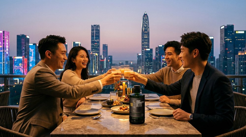 波夏擢跃10年阿索尔布罗斯入口顺滑,蜂蜜、燕麦奶与淡奶油带来的柔和质地,率先铺陈出温暖的基调;随后,波夏擢跃10年标志性的烟熏泥煤风味缓缓浮现,为整杯酒注入深度与力量。尾段以肉豆蔻的辛香收束,温润而持久。甜与烟、柔与烈在杯中达成平衡,与这座城市的精神也在碰杯时共鸣——奋斗的坚毅与生活的温柔,在杯中交织,为新一年的前行与沉淀之间,铺设着这座城市独特的节奏。