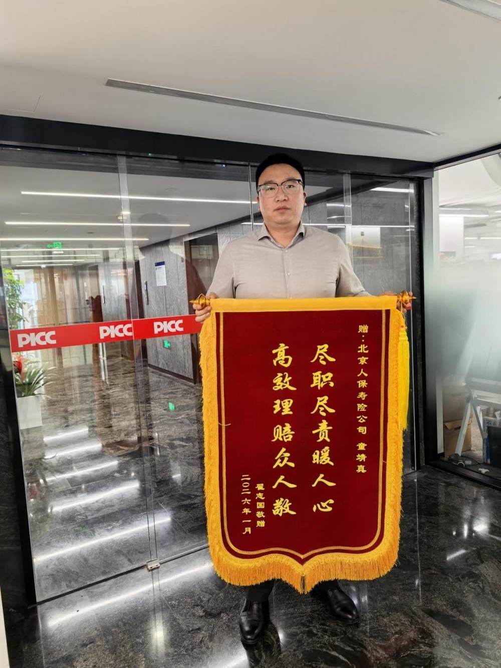 2025年12月,经过两个多月的治疗,该名员工顺利完成主要治疗阶段。在童靖真经理的全程指导与协助下,员工父亲备齐所有理赔资料,并完成重大疾病保险及医疗险理赔申请提交。不久后,理赔款成功到账,极大缓解了这个家庭的经济压力,为后续康复治疗提供了坚实保障。欣喜之余,员工父亲第一时间联系童靖真表达感谢,甚至提出以现金形式致谢,被童靖真婉言谢绝。为表达这份沉甸甸的感激,老人特意定制了一面锦旗送给童靖真,锦旗上的每个字即是对他服务的高度认可,更是对“人民保险”服务温度的真切肯定。