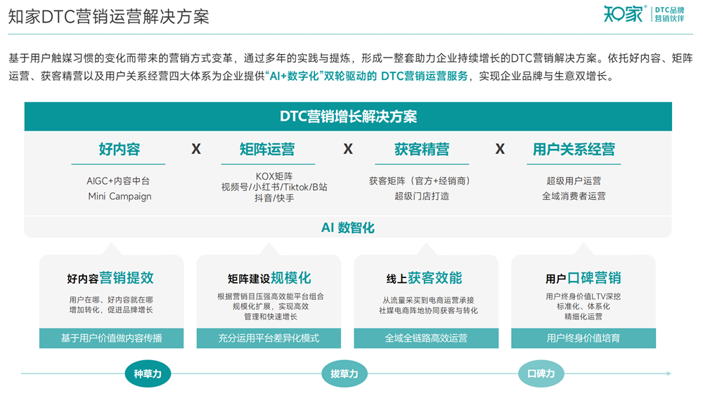 这十一年间,互联网从PC端走向移动端,社交媒体从微博进化到短视频、直播,消费者的注意力被无限碎片化,而营销行业自身也经历了数次深刻的范式转移。我们亲历了流量红利的起伏,见证了许多品牌的诞生与消逝,知家DTC之所以能走到今天,且走得越来越稳,核心在于我们从未动摇对“用户主权”的信仰。我们经历了从新媒体代运营到DTC品牌全链路服务的转型,从单一的图文种草到如今的“KOX全矩阵”、“全链路营销”和“全域消费者运营”服务。工具与方法在持续迭代,但内核始终如一:我们始终关注那个具体而鲜活“人”,关注如何让品牌与用户建立最深层的连接。